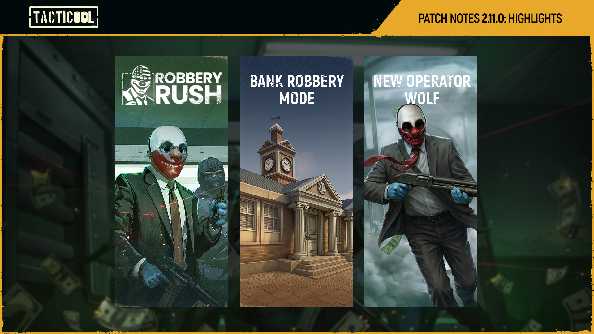 The ROBBERY RUSH event is back in the style of one of the most recognizable heist franchises! The collaboration between our top-down tactical shooter and PAYDAY brings the true heist experience to the revamped PvE BANK ROBBERY mode, where you can break into the SCB-themed bank and then turn your loot into truly valuable rewards. Choose a mask worn by one of the iconic heisters from the PAYDAY Gang and get the job done with extra skills!