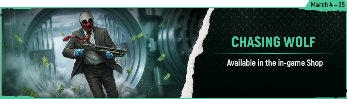 The "CHASING WOLF" event will be available in the in-game Shop from March 4 to March 25. Don't miss your chance to strengthen your Tactical Group with a member of the PAYDAY Gang!